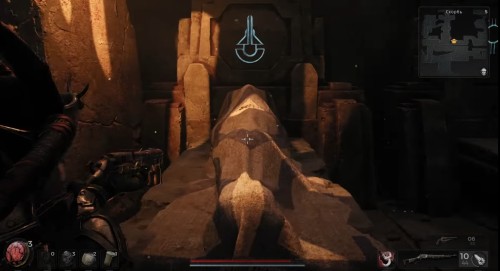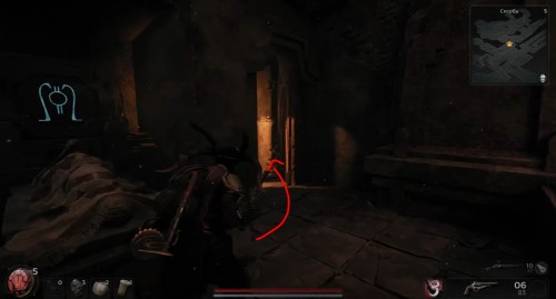 Возвратитесь назад в усыпальницу, где вы решали головоломку с циферблатом и символами. Поверните налево, пройдите через дверь слева, которую вы ранее открыли, спуститесь по лесенке вниз и снова сверните влево два раза.