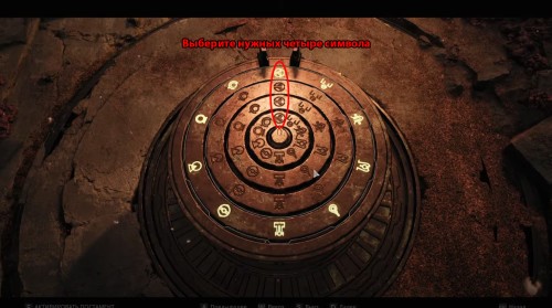 На верхнем уровне подойдите к циферблату возле закрытой круглой двери и взаимодействуйте с ним. Теперь вам нужно выбрать 4 символа, которые вы запомнили, на этом устройстве. Судя по всему, указывать их можно в любом порядке. Затем нажмите на кнопку «Активировать постамент»