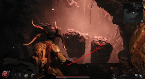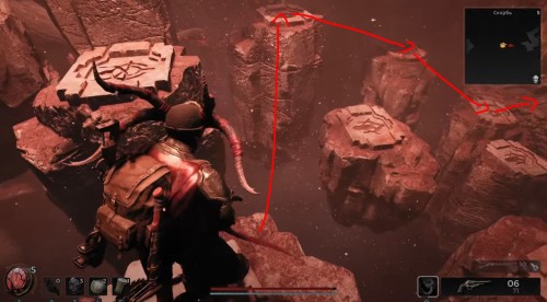 Спуститесь по ступенькам еще ниже, пока не попадете в открытое пространство. Продолжайте спускаться, расправляясь по пути с монстрами, пока не дойдете до расщелины с несколькими парящими камнями, на которых нарисованы символы. Здесь имеются невидимые мостики, соединяющие определенные платформы. Для их выявления стреляйте в пространство между площадками и смотрите, не появляется ли грязь в воздухе, – если она возникает, значит, тут есть мост.