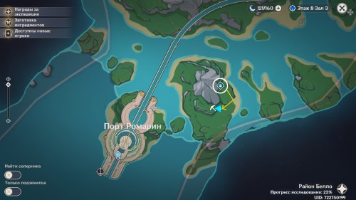 Последний подводный маршрут можно отыскать на северо-востоке доступной части региона. Телепортируйтесь к метке, указанной на карте, и соберите несколько камней около места перемещения.