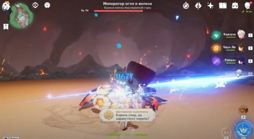 Здесь все довольно просто. В самом начале боя у Императора огня и железа уже будет присутствовать двойной рог, поэтому вашей главной задачей станет его уничтожение. Для этого атакуйте его стихиями, которые взаимодействуют с Пиро – лучше всего в данном случае работают Гидро (1 место) и Электро (2 место) атаки.