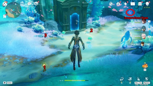 Если коротко, то вам нужно активировать 3 передатчика пневмусии в определенной последовательности. Нужный порядок показан на скриншоте ниже (его можно узнать самостоятельно, ударив по ближайшему эхолюску). Для включения столба нужно сначала подобрать энергоблок усии (фиолетовая сфера), а потом ударить по нему.
