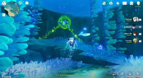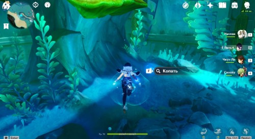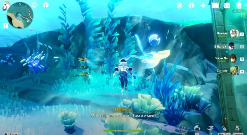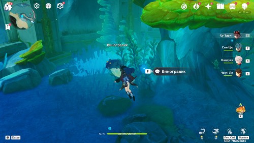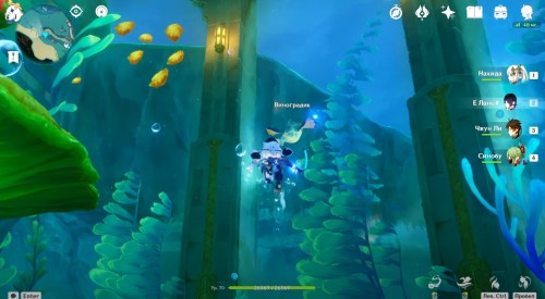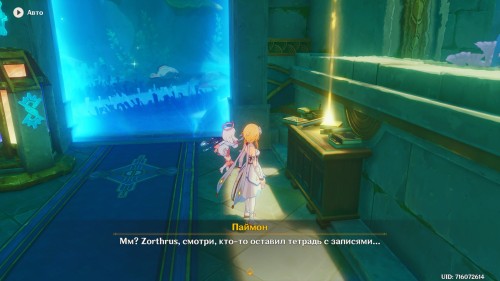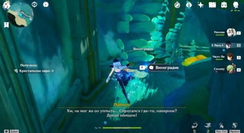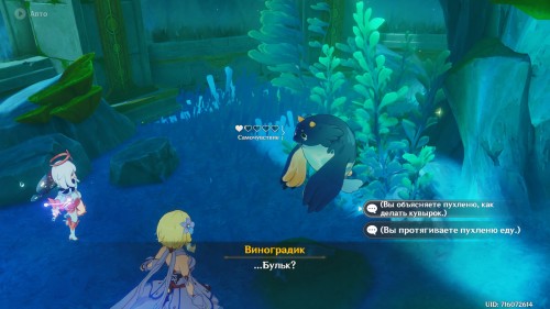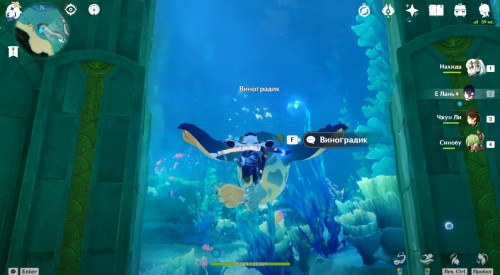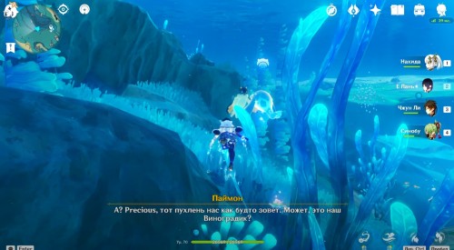 Если вы все сделали правильно, то рядом появится богатый сундук. Теперь вы сможете спокойно пройти через барьер. Сразу после этого начнется кат-сцена с Паймон. Из записей вы узнаете про пухленя. Завершив беседу, пройдите через второй барьер, чтобы попасть в аквариум. Тут вы увидите Виноградика, лежащего верх брюхом.