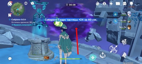 Вашей задачей будет собрать 24 гидро частицы за 40 секунд. Процесс будет проходить следующим образом: вы зайдете в портал и пролетите через часть элементальных сфер, после чего начнете падать вниз. В это время вам необходимо активировать следующий проход, чтобы продолжить движение через частицы. Это действие надо будет повторить еще раз. Если вы все сделаете правильно, то приземлитесь на платформу, где будет последняя фея.