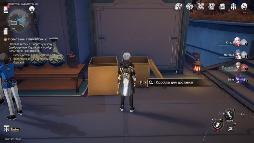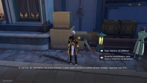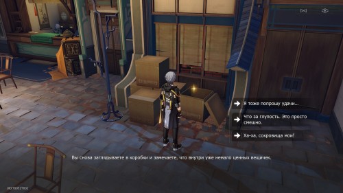 От предыдущего якоря пройдите на север к столикам, и позади них вы обнаружите новые коробки. Взаимодействуйте с ними. Затем вы сможете выбрать один из трех ответов: