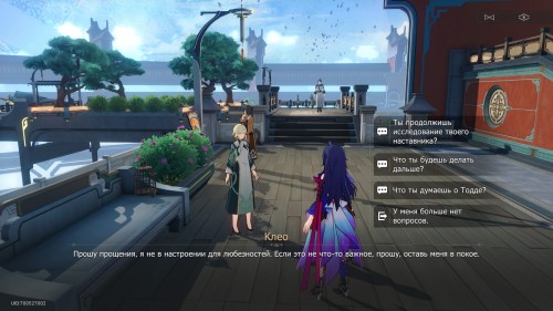 В этом случае вы скажите, что ее наставник просто пошел в другую часть Лофу Сяньчжоу для ее изучения. Ученая будет расстроена вашим ответом, так как посчитает, что ей не удалось застать Тодда в гавани. Потом она перестанет с вами разговаривать, попросив оставить ее одну. Вы разблокируете трофей «Кривая дорожка», за который дают 5 звездных нефритов.