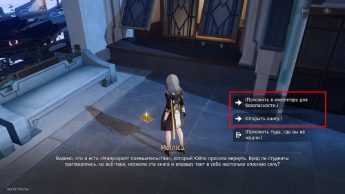 Когда парочка отправится в лечебницу, на земле она оставит фолиант. Вы можете как сразу же убрать «Манускрипт помешательства» в инвентарь, так и опробовать его влияние на себе. После некоторого помутнения сознания вы все равно обнаружите рукопись в рюкзаке.