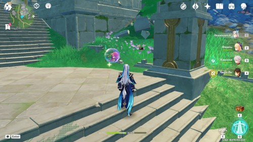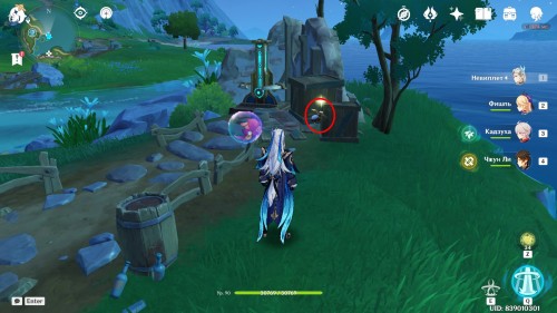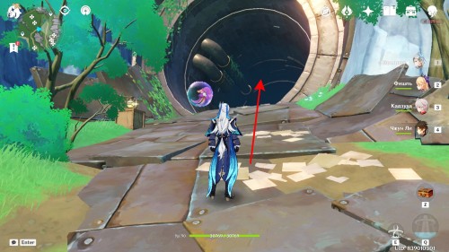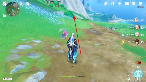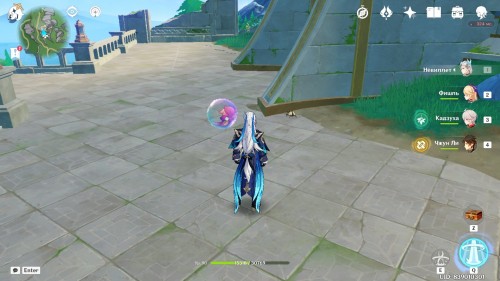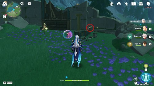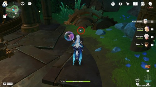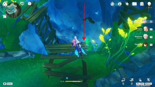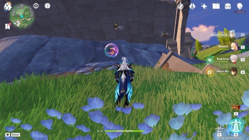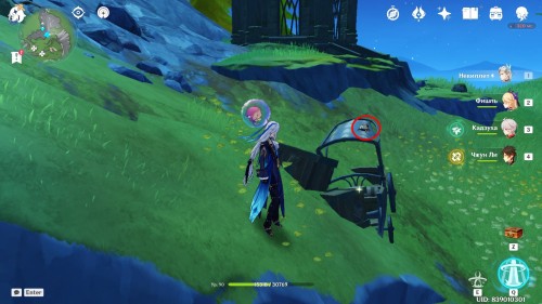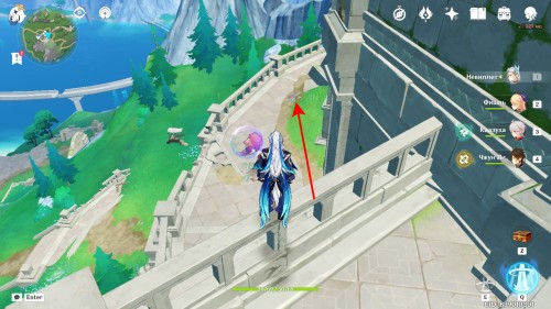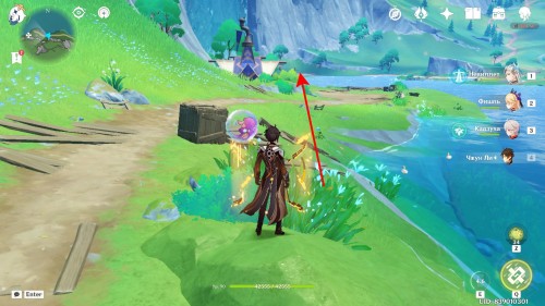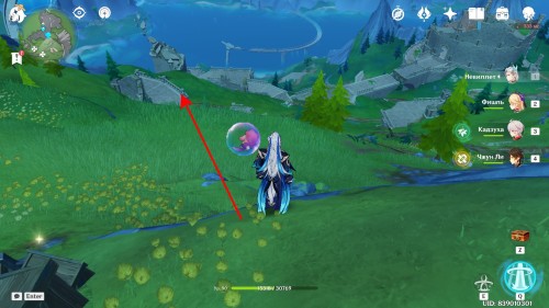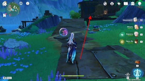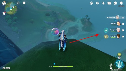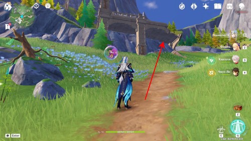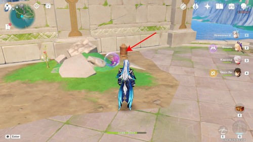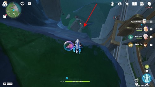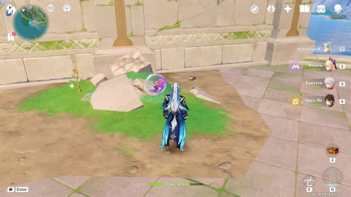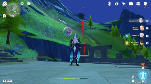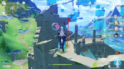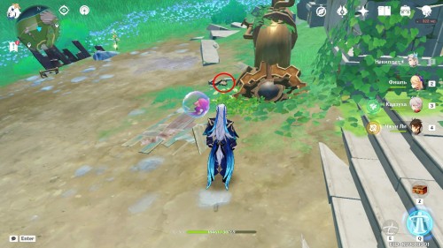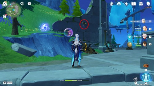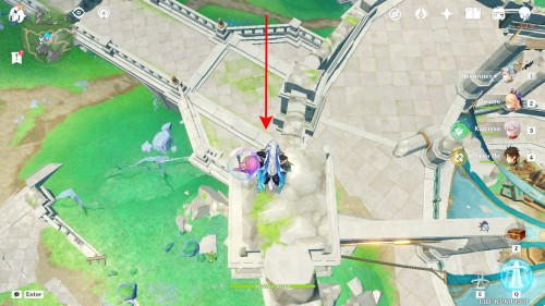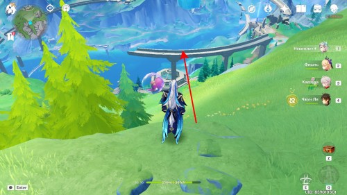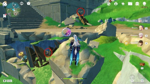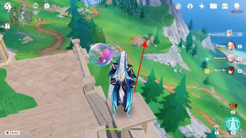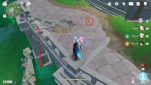 Подойдите к обрыву рядом с водопадом и летите к островам, расположенным около противоположного берега. На самом большом из них над ящиками около загадки со стабилизатором порхает нужное устройство. Будьте осторожны: рядом ходят несколько опасных оперативников Фатуи.