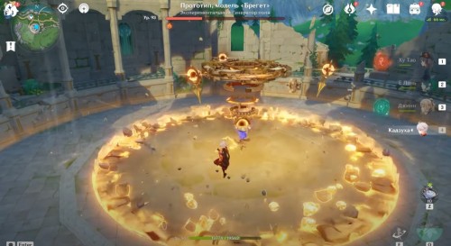 Босс накапливает энергию, а затем наносит Гео урон по огромной области вокруг себя. Поскорее отбегите на край арены, чтобы не получить урон.