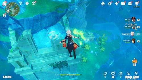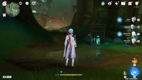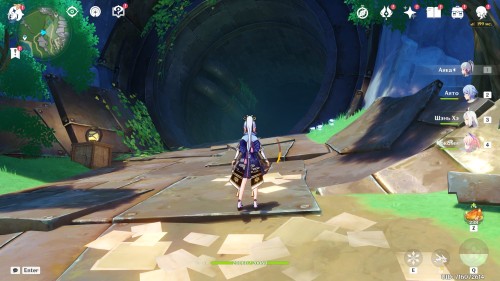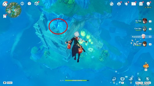 Отправляйтесь на восток от Руин Центральной лаборатории и доберитесь до лагеря хиличурлов, показанного на скриншотах ниже. Там заберитесь на клешню огромного робота и соберите очередной минерал.