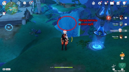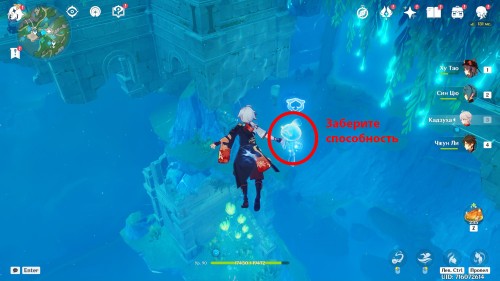 Погрузившись в кубик, добудьте способность ксенохромной медузы (стукните ее ЛКМ), а затем выпустите бомбу (зажмите клавишу «E») в сторону булыжника с синей трещиной, спрятанного в руинах. В результате вы расчистите проход и сможете забрать загадочный минерал.