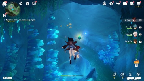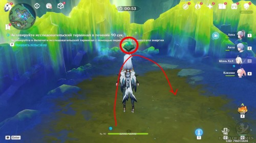 Вы сможете попасть в область с зеленым камнем во время или после завершения квеста «Коварный свет из глубин». Для старта задания отправляйтесь в восточную часть Института кинетической энергии и погрузитесь под воду рядом с телепортом. Затем разломайте камень с синей трещиной с помощью способности медузы и погрузитесь в туннель.