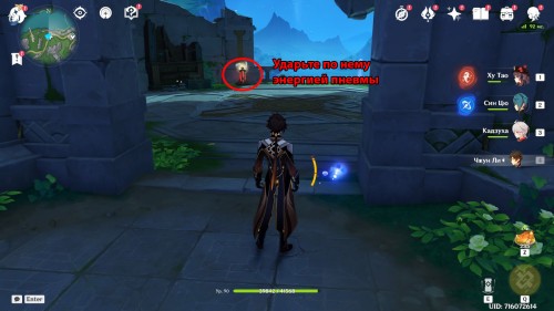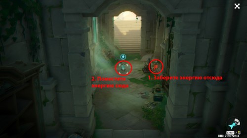 Снова телепортируйтесь к точке перемещения возле босса, а затем спрыгните с края обрыва на севере и залетите на нижний этаж руин. Перед этим подберите энергоблок пневмы (фиолетовая сфера) на стене. Спуститесь вниз по лесенке, сверните влево и ударьте по накопителю энергии усии.