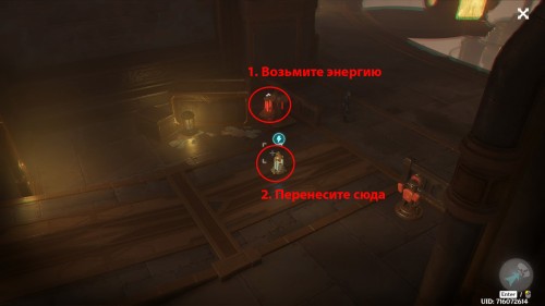 Взаимодействуйте с терминалом, стоящим справа, для активации видеоискателя. Наведите камеру на красную лампочку для смены ракурса. Затем посмотрите на заряженный накопитель (бирюзового цвета) внизу и нажмите «Enter», чтобы забрать из него энергию. Передайте ее накопителю, который вы ранее поставили возле груши.