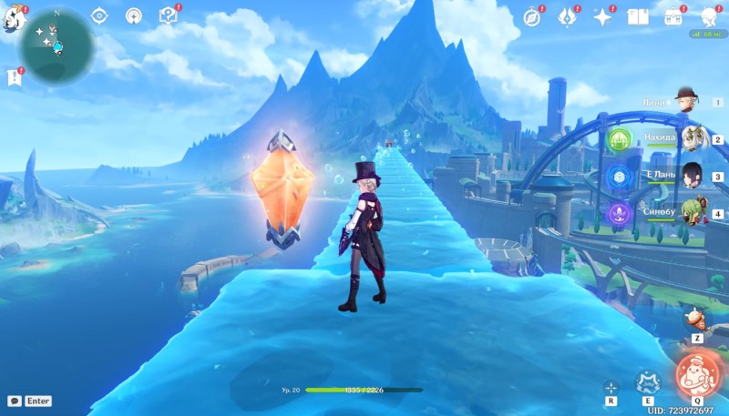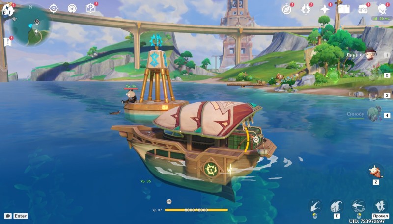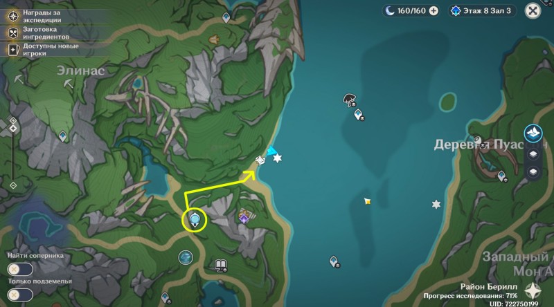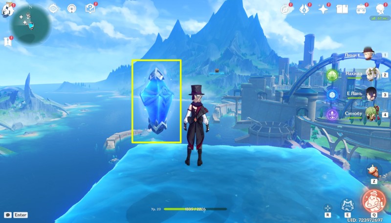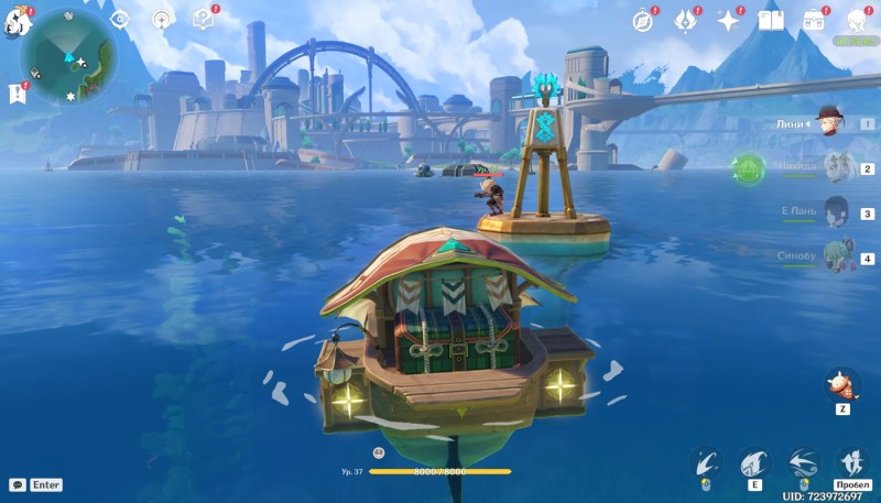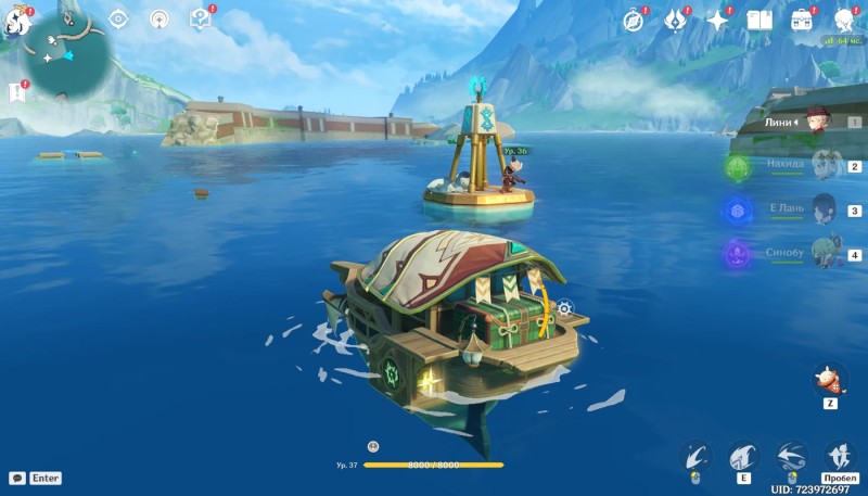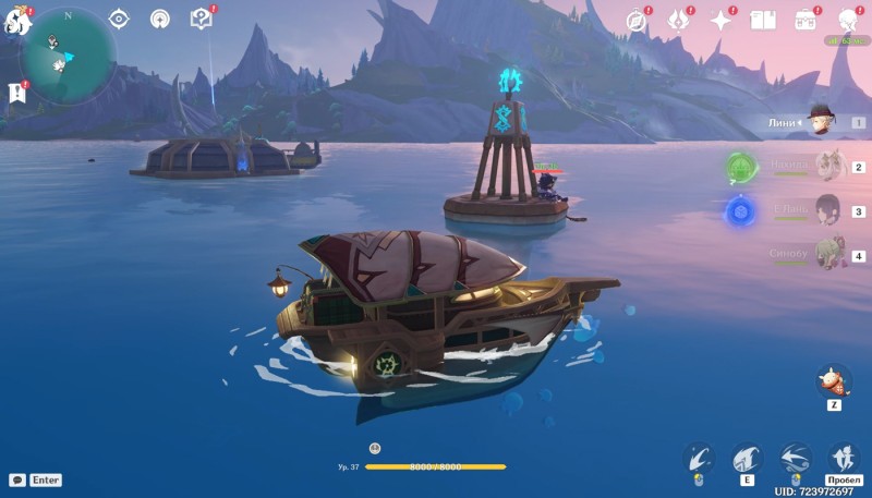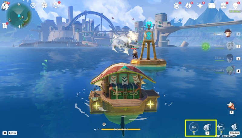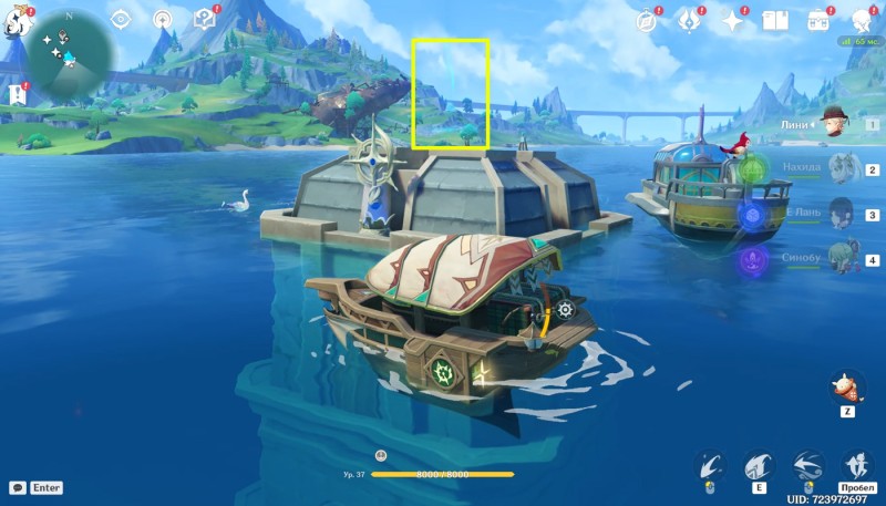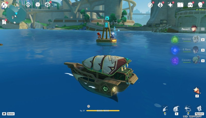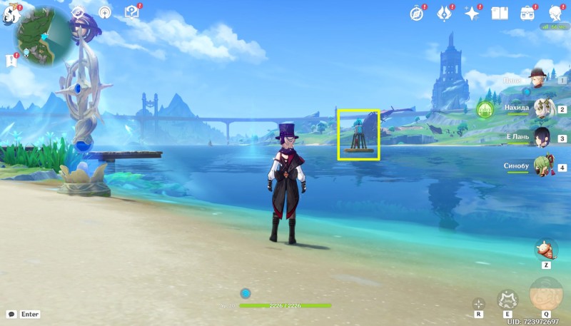 Начнем со статуи Гидро Архонта в районе Берилл: бегите по тропе на восток до пляжа с якорной стоянкой. С побережья будет видно первый буй с лучником-хиличурлом, атакующим пиро стрелами.