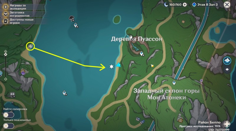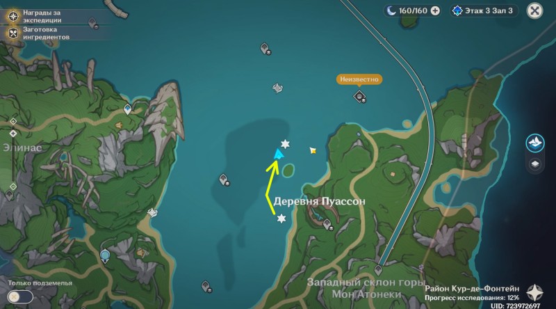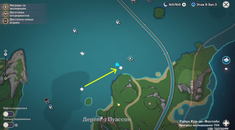 Следующая цель находится к юго-западу от деревни Пуассон: на берегу перед дайвером с именем Ив можно заметить поплавок, на котором стоит анемо шамачурл.