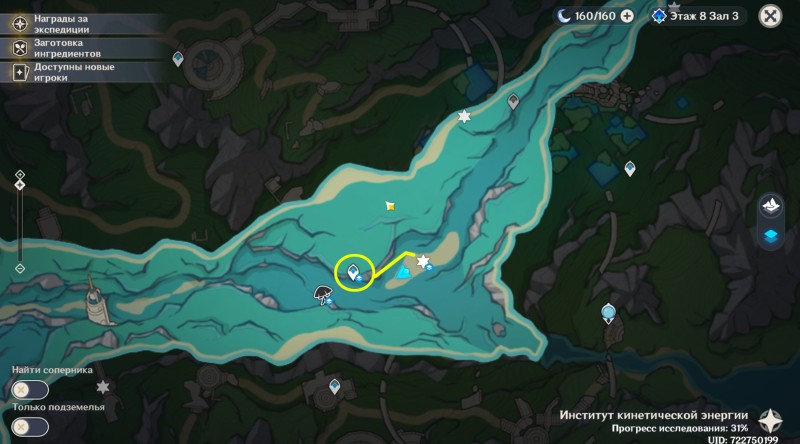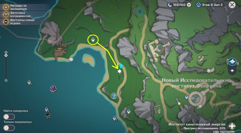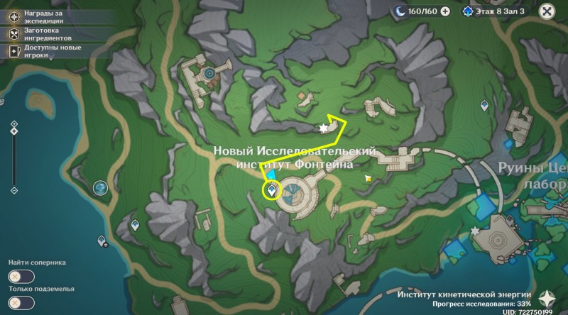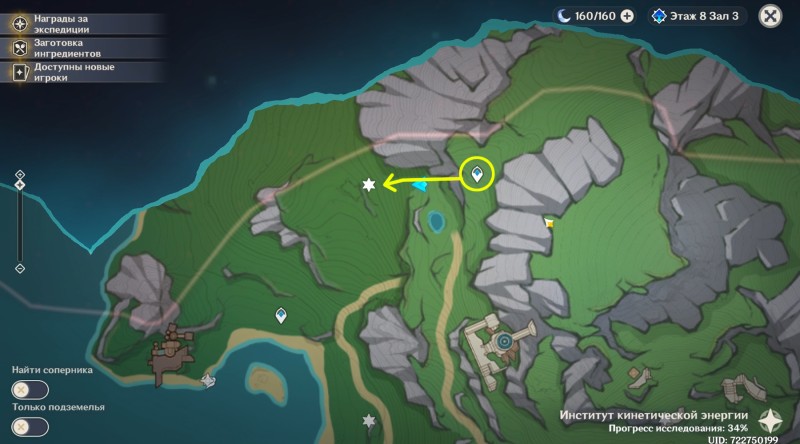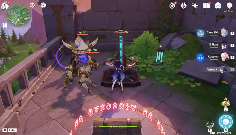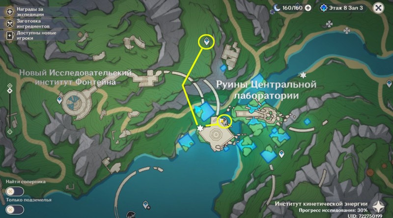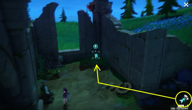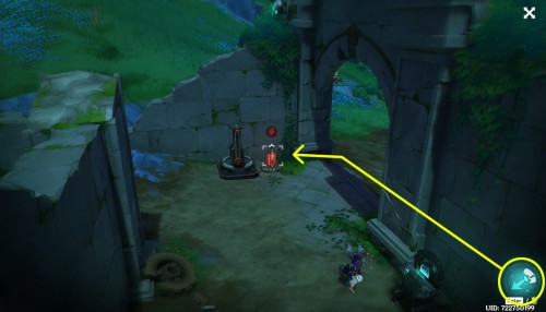 Следующий стабилизатор находится также недалеко от телепорта у входа в Новый Исследовательский институт Фонтейна: бегите на северо-восток до возвышенности с руинами. В углу разрушенной стены стоит аппарат, а над ним – сфера пневмы, которую нужно подобрать и атаковать энергоблок снизу.
