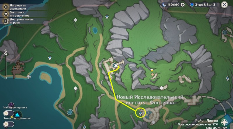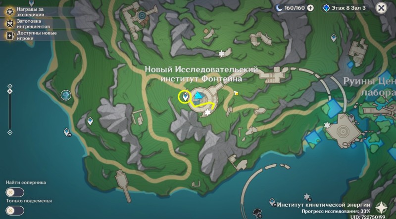 Восьмую головоломку можно найти на нижнем ярусе Нового Исследовательского института Фонтейна. Переместитесь к телепорту перед зданием, бегите через центральный зал в восточную половину постройки и прыгайте вниз.