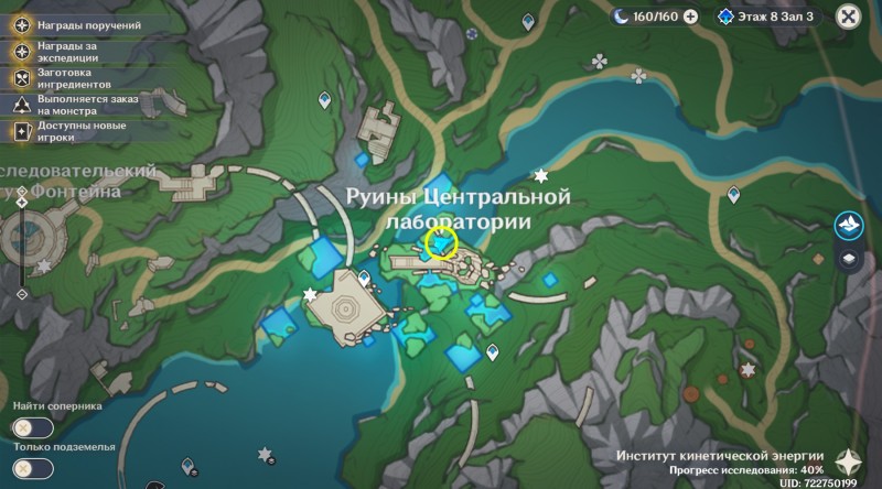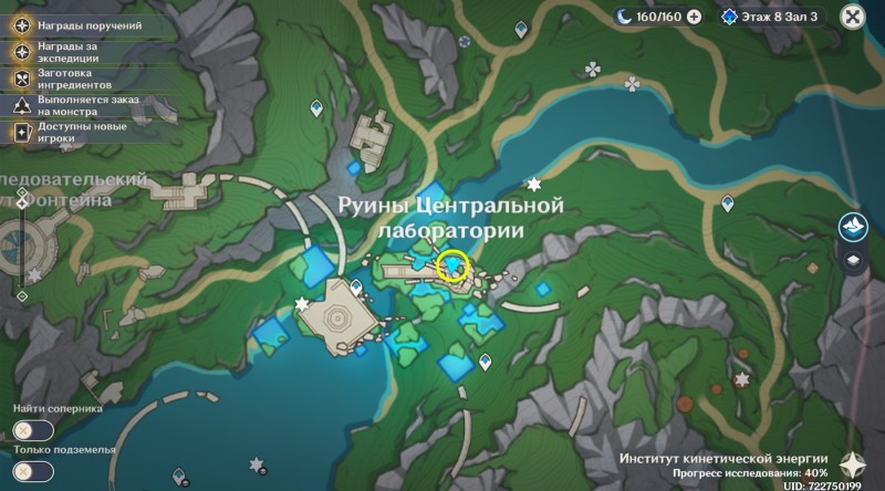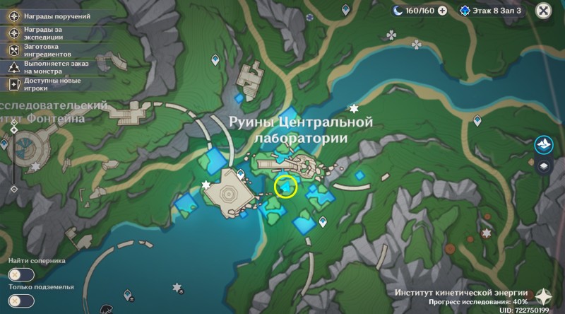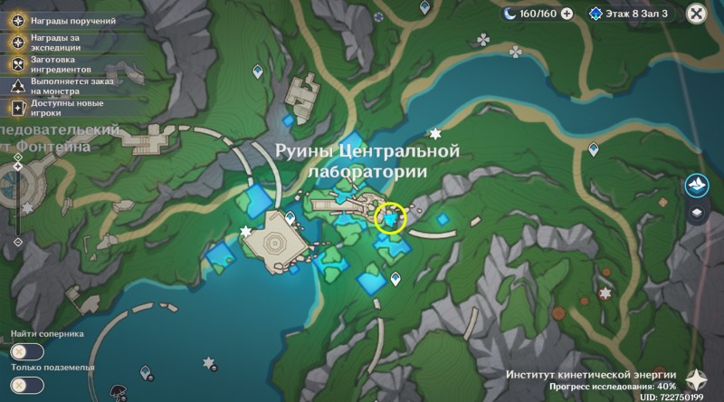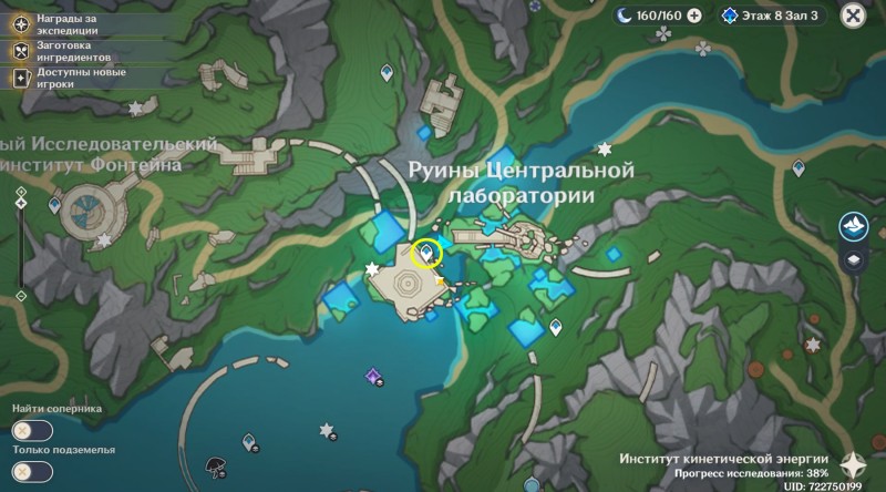 Головоломка с феями спрятана в одном из водяных кубов над руинами Центральной лаборатории (если вы еще не открыли отмеченный телепорт, то советуем ознакомиться с гайдом по заданию «Институт Фонтейна, стоящий в руинах» – в ходе его выполнения можно последовательно добраться до самого высокого телепорта в Гидро регионе). От места перемещения спуститесь к разрушенной мостовой и ныряйте в воду справа: загадка находится под водой в верхней половине куба, перед развалинами с закрытой каменной дверью.