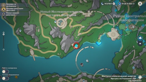 Чтобы найти сундук, отправляйтесь на юг от телепорта, расположенного в здании Нового института. В развалинах у подножия горы на берегу реки вы увидите закрытый сундук и загадку с кристаллами уровня воды и переключателями.