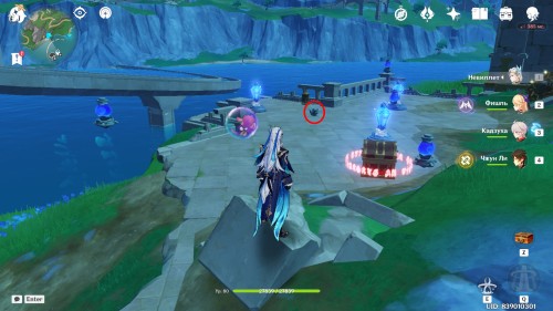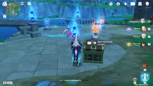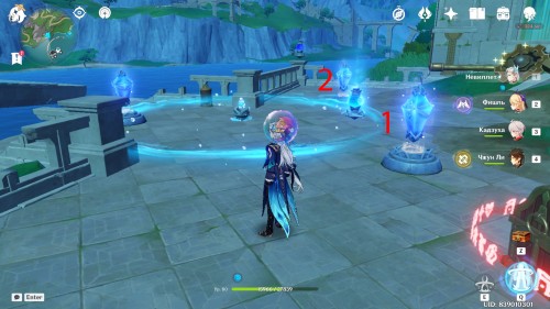 После этого кристаллы придут в движение и активируются друг за другом. Когда это случится, вы получите доступ к стоящему рядом драгоценному сундуку, в котором обнаружите 10 примогемов, 3 гидро печати, материалы улучшения для персонажей, оружие и артефакты.