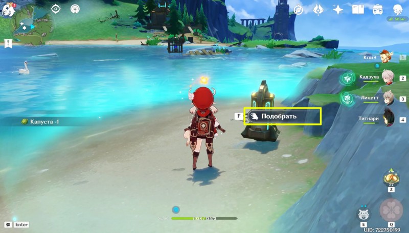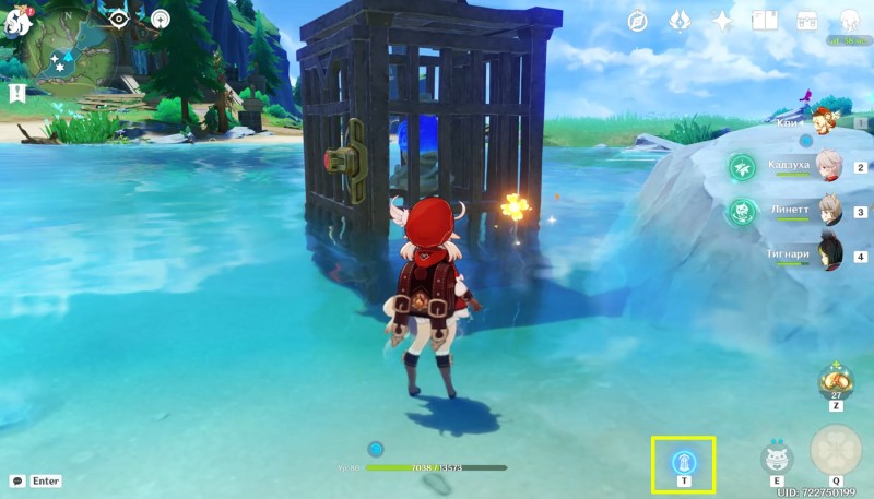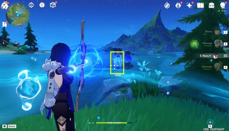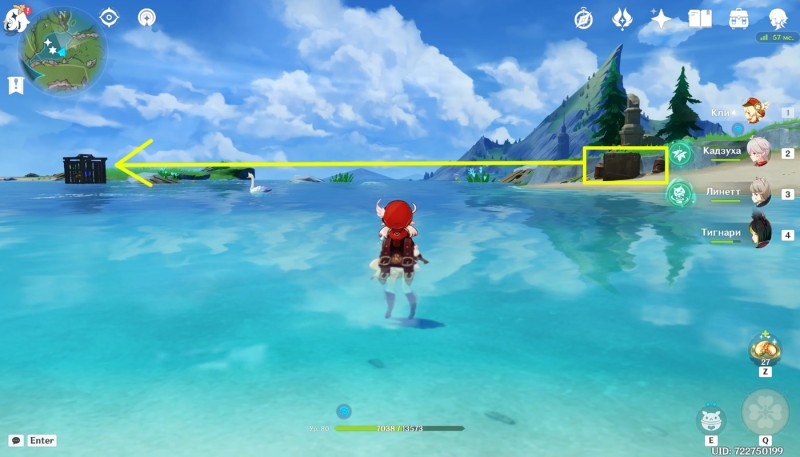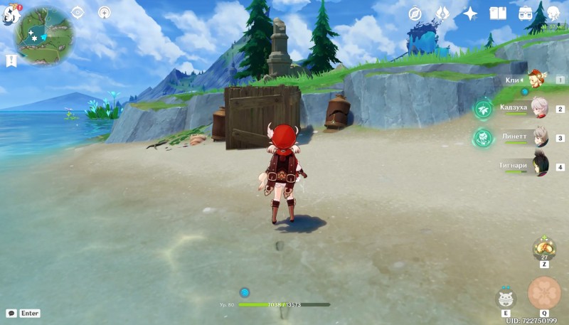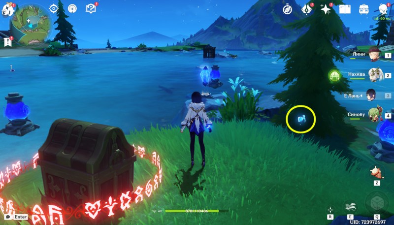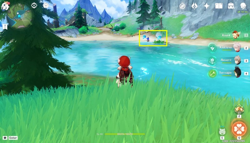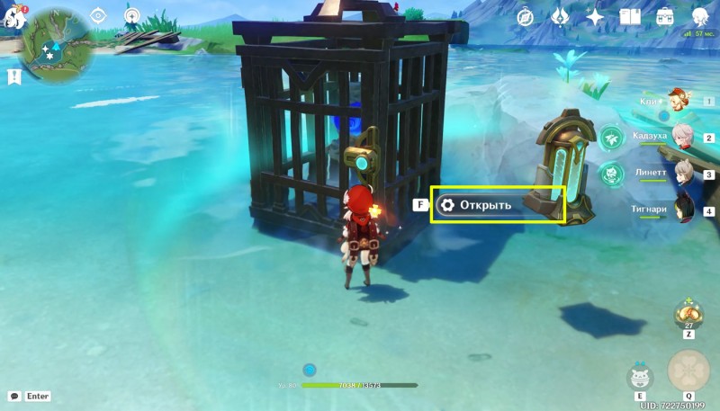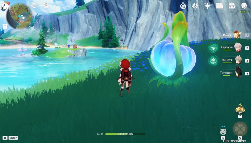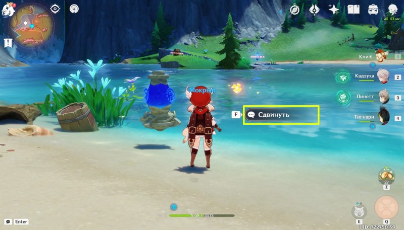 Первый кристалл находится в западной половине локации: на поляне можно заметить плод водного нефрита. Атакуйте растение, используя элементальные реакции, чтобы высвободить из него накопившейся избыток гидро элемента, а когда плод лопнет, направьте измеритель влажности к сундуку, кликнув «Сдвинуть» (сопровождать его не нужно).