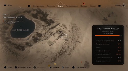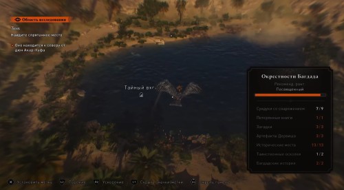 Добыв все 10 таинственных осколков, переместитесь к Северному оазису, расположенному в северных Окрестностях Багдада к востоку от Анбара (стартовый город). Затем используйте орла, чтобы найти тайный вход в центре водоема. Погрузитесь в воду и заплывите в отверстие внизу. Доплывите до дна и отыщите там проход в подводную пещеру.