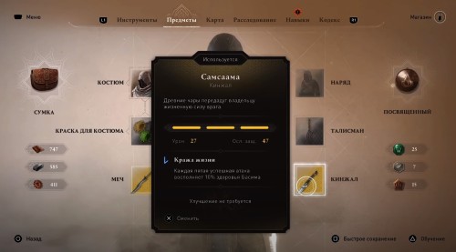 Здесь вы обнаружите три постамента, в которые необходимо вставлять таинственные осколки. В первый из них нужно поместить 2 осколка, чтобы получить легендарный кинжал Самсаама. Его характеристики показаны на скриншоте ниже.