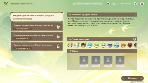 Что касается врагов, то в этом данже вы встретитесь с различными видами плесенников. Они будут появляться группами, но мы рекомендуем вам все же взять с собой стяжку, чтобы монстры не разбредались по арене. Также вам лучше выбирать героев, наносящих урон по площади, поскольку вам придется иметь дело с большим количеством мелких мобов. Но хорошо прокачанные персонажи, направленные на дамаг по одиночным целям, также вполне способны справиться с испытанием. Источниками заблуждения на данном этапе являются три моровика: дендро, гидро и гео. Как только один из них появится, подходите к нему как можно ближе, чтобы нанести больший урон с помощью Кристалла вдохновения. Всего в этом испытании надо набрать 2000 очков, чтобы собрать все возможные награды.