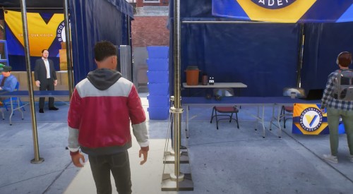 Переодевшись, идите вперед, двигаясь к квестовому маркеру. По дороге можете поболтать с другими учениками. Добравшись до указанного места, побеседуйте со своими друзьями. Затем вам нужно будет подойти как можно ближе к директору и офицеру полиции. Для этого отыщите небольшое отверстие между двумя шатрами, находящимися слева от решетчатой двери.