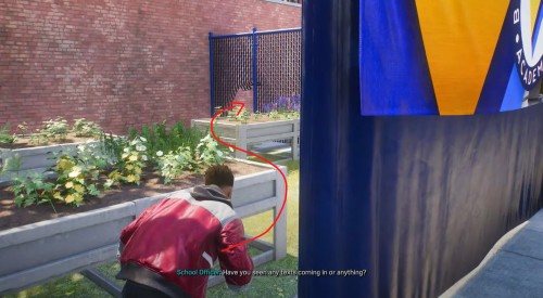 Поднимитесь на крышу надземного перехода, соединяющего две части учебного заведения. На верхушке трубы вы обнаружите рюкзак – нажмите на него для старта данной миссии. Посмотрите короткий ролик.