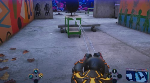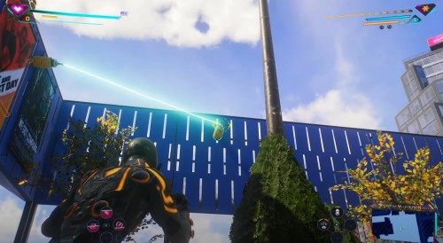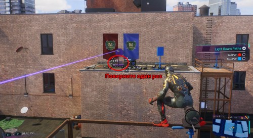 Теперь развернитесь и спрыгните вниз, следуя за кабелем. Вы увидите на синем стенде еще две желтые антенны, которые необходимо соединить между собой паутиной.