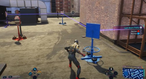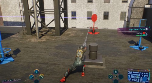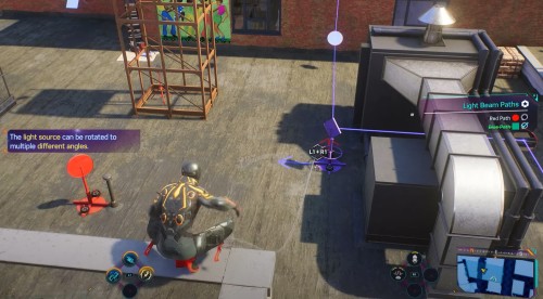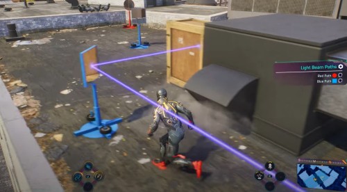 Двигайтесь к следующему маркеру. На этот раз загадка будет находиться внизу, на уровне улиц. Подойдите к лазеру, показанному на скриншотах ниже, и два раза поверните вентиль под ним, чтобы луч начал светить в зеркало с правой стороны. Потом подойдите к тележке и уберите ее с пути луча.