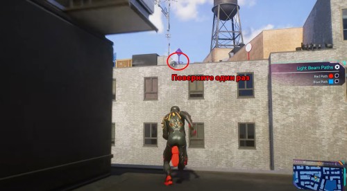 Теперь снова поверните первый фиолетовый вентиль, чтобы луч начал светить влево в красное зеркало. Внизу поверните второй фиолетовый клапан два раза и опять вернитесь на крышу противоположного здания. Тут поверните третий фиолетовый вентиль два раза.