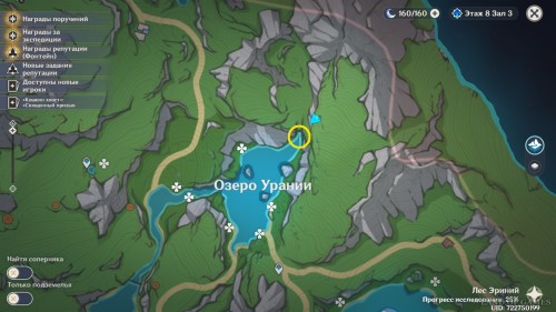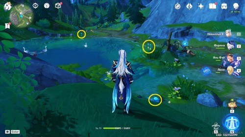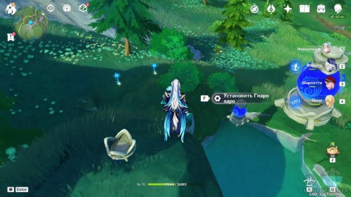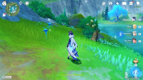 Последняя точка фарма на северном маршруте: небольшое озерцо, над которым расположена головоломка с сосудами определения влажности. Пробежав вверх по склону от Урании, вы наткнетесь на углубление с водой, вокруг которого растет 3 голубых лилии.