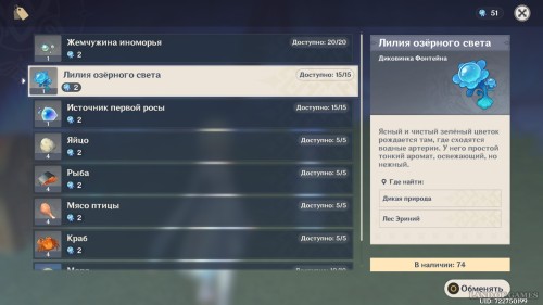 В официальном описании говорится, что Лилия озерного света является чистым зеленым цветком, рождающимся в местах, где происходит схождение водных артерий. Отыскать его можно в дикой природе на территории леса Эриний. Советуем вам также держать перед глазами интерактивную карту Фонтейна, чтобы лучше ориентироваться на местности.