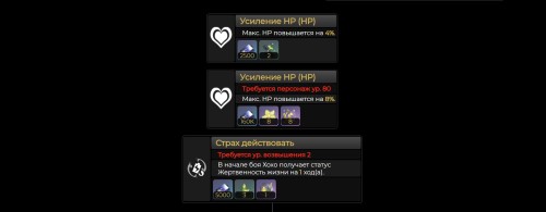 Что касается пассивного таланта героини – «Одержимость: Метафизическая связь», то он накладывает на нее статус «Жертвенность жизни», действующий два хода, после применения своего умения. Его продолжительность снижается на один ход после начала хода Хохо. При наличии этого эффекта во время старта хода союзника или использования им сверхспособности у него восстанавливается здоровье в размере 3%~5,25% от максимального здоровья стажерки +30-154 единиц. Кроме того, лечение получают все члены отряда, имеющие от 50% здоровья и ниже.