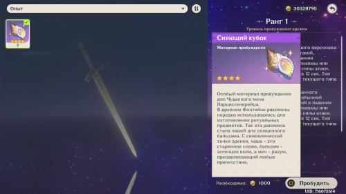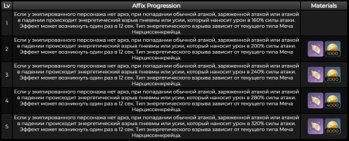 Так как существует всего лишь один экземпляр меча, для улучшения его пассивки вам придется использовать особые предметы «Сияющие кубки». Для их получения вам нужно будет сначала отыскать иссохшие раковины, а потом обменять их возле фонтана Аннапаузиса на нужные материалы. Мы в деталях рассказали об этом в отдельном материале. Ниже вы можете увидеть, какие бонусы дает это оружие на каждом уровне пробуждения.
