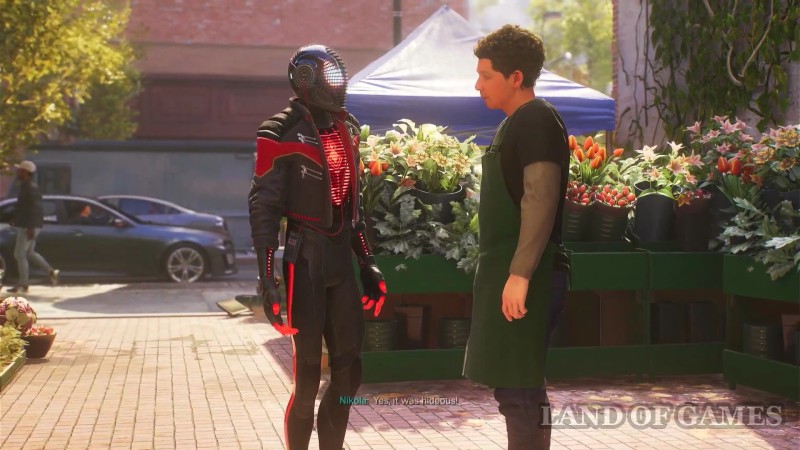 Летите в точку, отмеченную маркером на карте. Переговорите с продавцом цветочной лавки и девушкой.