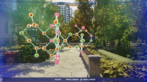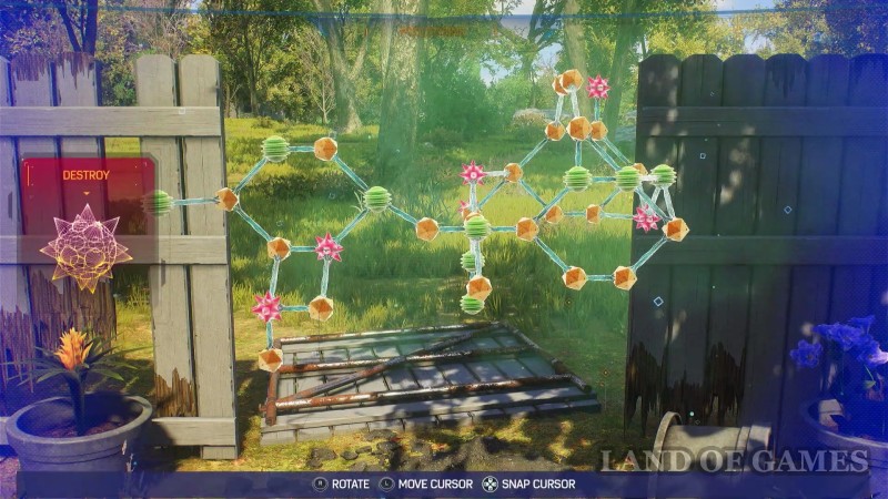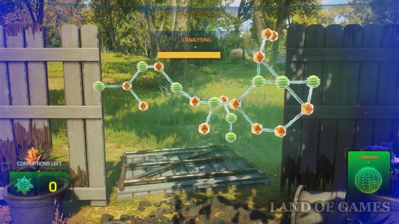 Пройдите во двор и воспользуйтесь сканером. Обнаружите следы, которые приведут вас к загадке – решите ее, избавившись от красных атомов.