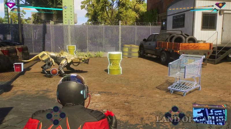 После этого появится голубой след – бегите по нему и найдете робота, который на вас нападет.