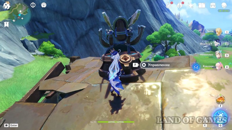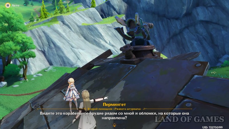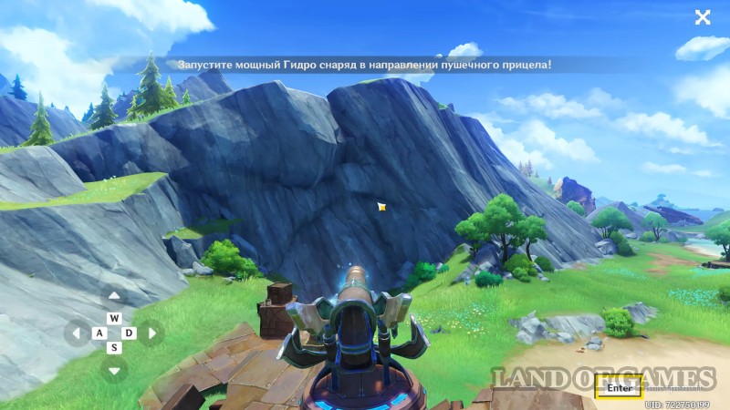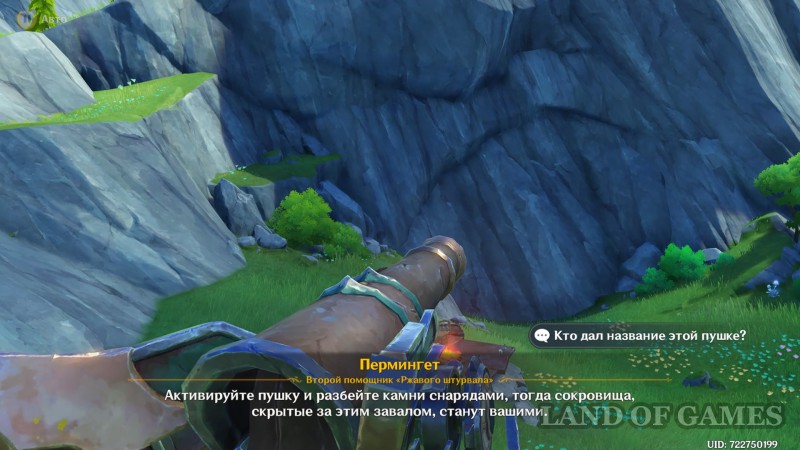 Успешно пройдя опрос от Пермингет, возьмите управление над пушкой и, не меняя положение прицела, совершите выстрел (на ПК клавиша Enter): гидро снаряд раздробит каменную стену впереди и перед вами откроется проход с телепортом, перед которым будет ждать богатый ларец с 20 тысячами моры внутри.