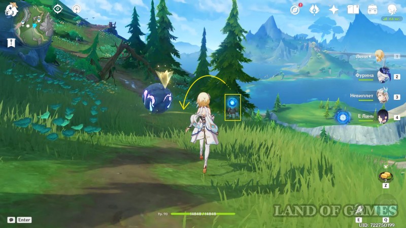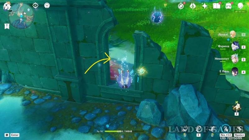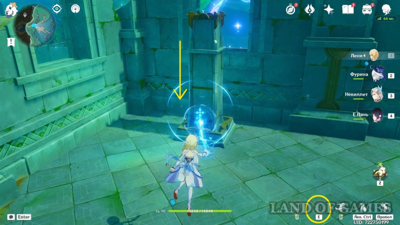 Далее кликните «взаимодействовать» на монументе с синей сферой, чтобы получить способность управлять снарядом. Подойдите к золотистой стрелке, после чего прицельтесь Е-шкой на каменный шар перед вами.