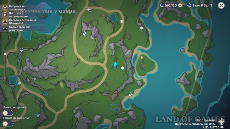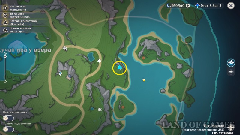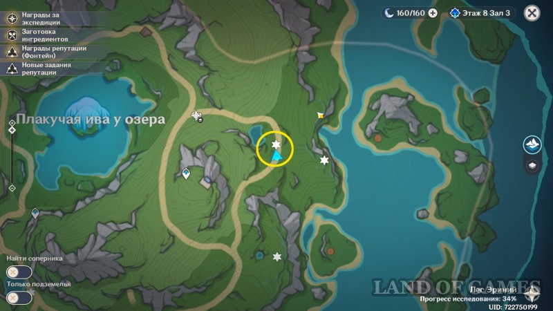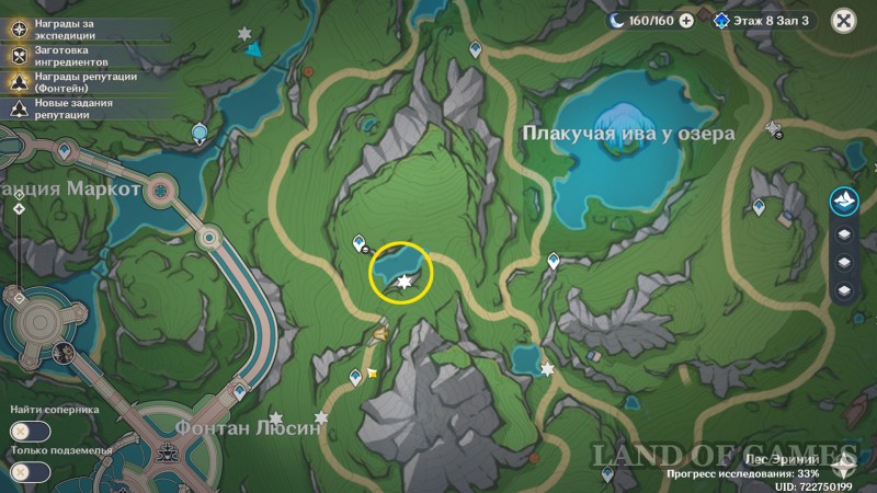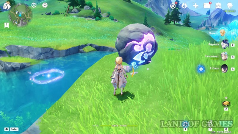 Четвертая головоломка находится около тропинки между скалами к юго-западу от Плакучей ивы. Доберитесь до нужного места перед живописным прудом, по берегу которого растут Лилии озерного света и бродят несколько хиличурлов (от последних придется избавиться).