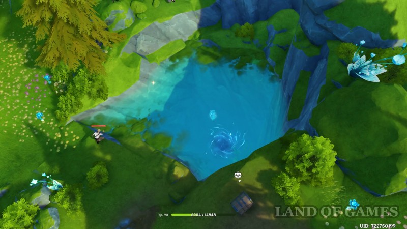 Подберите Е-шку осьминога у водоема, а затем приблизьтесь к каждому из ядер и атакуйте его навыком: как можно дольше удерживайте прицел на загрязнениях, чтобы лишить их всего ХП. После успешного уничтожения вредителей, вода станет чистой и в нее можно будет нырнуть.