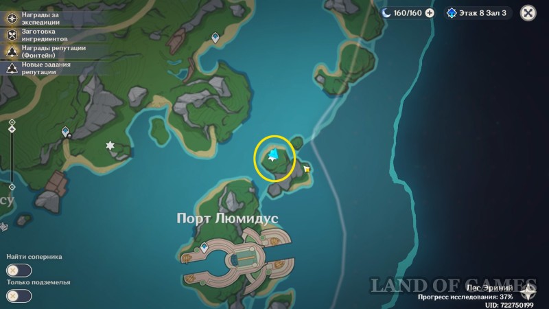 Восьмое место находится к юго-востоку от головоломки с Большими шляповидными медузами в области маленького водоема, близ которого бродят похитители сокровищ. За деревьями около ближайшего обрыва стоит каменная сфера и монумент с навыком осьминога: зарядите атаку по снаряду, целясь максимально заряженным ударом в сторону углубления с водой, окруженного бандитами.