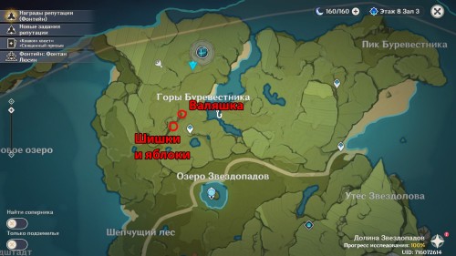 Если вы хотите максимально быстро сделать 10 снимков, не слоняясь по всему Тейвату, то просто переместитесь к телепорту в Горах буревестника (Мондштадт), а затем пройдите немного на запад и север – в указанных нами местах вы обнаружите 5 сосновых шишек, 3 яблока и 4 валяшки. Они растут на кустах и деревьях или валяются на земле.