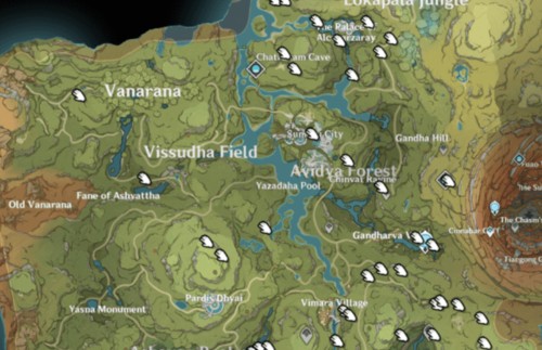 Если вам не хочется возвращаться в Мондштадт, то можете сфотографировать эти орешки, растущие в пустыне Сумеру. Их скопления показаны на карте ниже.