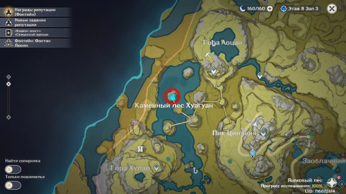 Сразу 8 яиц можно сфотографировать в Каменном лесу Хуагуан (Ли Юэ). Переместитесь к телепорту на северо-востоке от локации, а затем летите на юго-запад и приземлитесь на указанный пик. Используйте воздушные потоки, чтобы подняться выше.