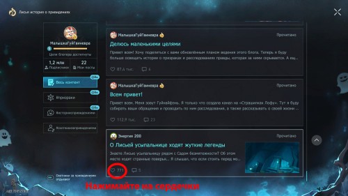 Взаимодействуйте со столом Охотников за привидениями, а потом перейдите в раздел «Страшилки Лофу». Находясь во вкладке «Весь контент», просто начните кликать по сердечкам (находятся в левой нижней части статей) у всех постов, пролистывая ленту вниз.